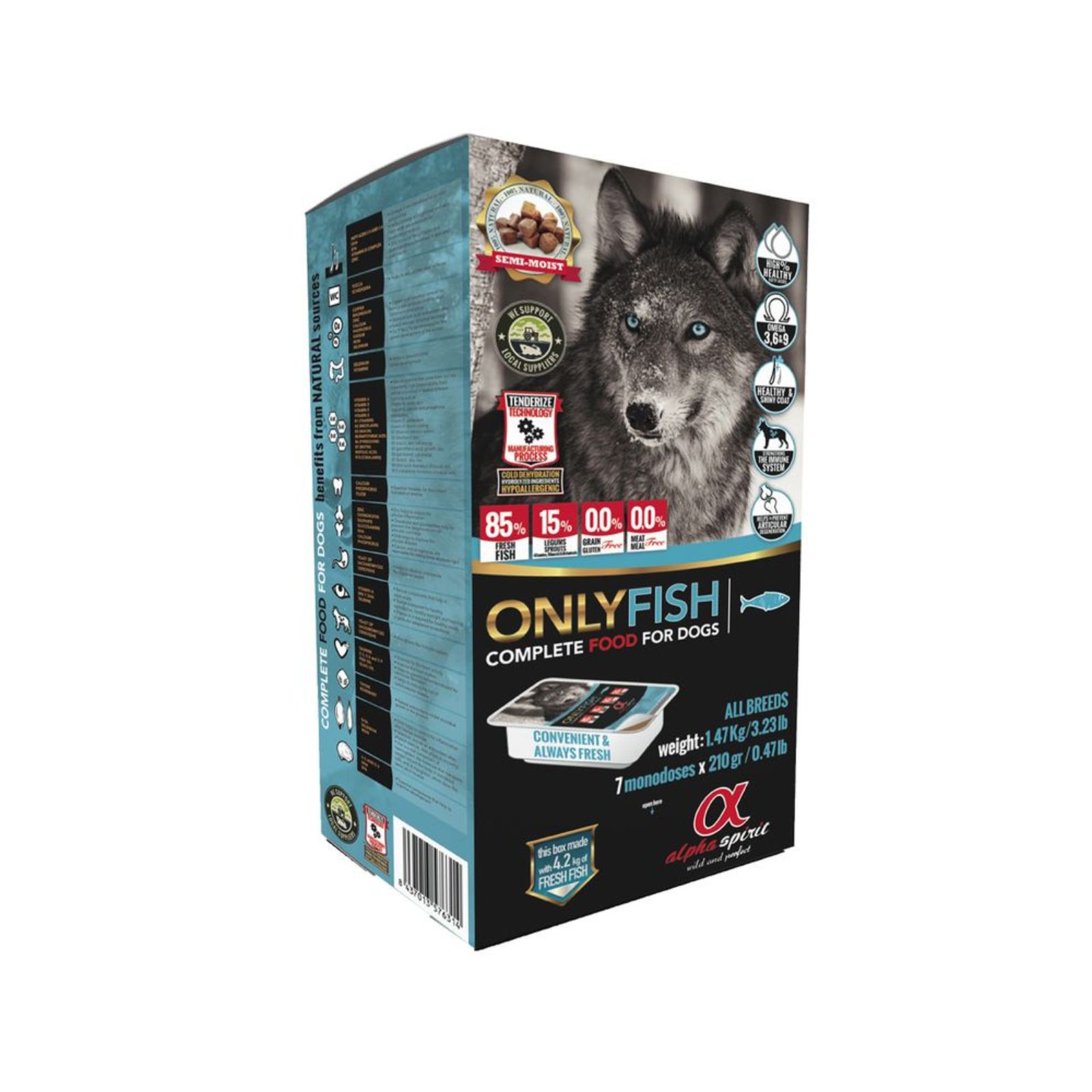 Alpha Spirit Fish to pełnoporcjowa, półwilgotna karma dla dorosłych psów, stworzona z myślą o naturalnych potrzebach żywieniowych czworonogów. Receptura bazuje na 85% świeżej ryby – bez dodatku mączki rybnej i zbóż – co czyni ją doskonałym wyborem dla psów z wrażliwym układem trawiennym oraz alergiami pokarmowymi.Karma wyróżnia się miękką, wilgotną konsystencją, która przypadnie do gustu nawet najbardziej wybrednym psom. Jest produkowana w innowacyjnym procesie technologicznym przypominającym tłoczenie na zimno, co zwiększa strawność i przyswajalność białek oraz składników odżywczych. Naturalne dodatki, takie jak drożdże piwne, glukozamina, chondroityna, zioła i warzywa, wspierają odporność, zdrowe stawy, sierść i ogólną witalność pupila.