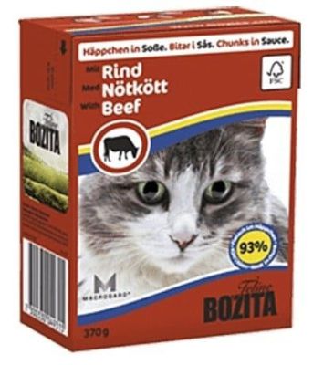 Bozita mokra karma w kartoniku z wołowiną w sosie to szwedzka jakość i smakowite rozwiązanie żywieniowe dla Twojego kota.  Jest to pełnoporcjowa, bezzbożowa karma, która  w swoim składzie nie zawiera glutenu, cukru, soi i sztucznych konserwantów. Te pyszne mięsne kawałki są pełnowartościowym posiłkiem dla Twojego pupila, każda porcja to aż 93% mięsa i zawiera aminokwasy, witaminy oraz minerały zaspokajające codzienne zapotrzebowanie Twojego kota. Jest także wsparciem dla układu odpornościowego, ponieważ zawiera aminokwas Macrogard. Swoim smakiem i aromatem zachwyci nawet wyszukane podniebienie Twojego pupila.
