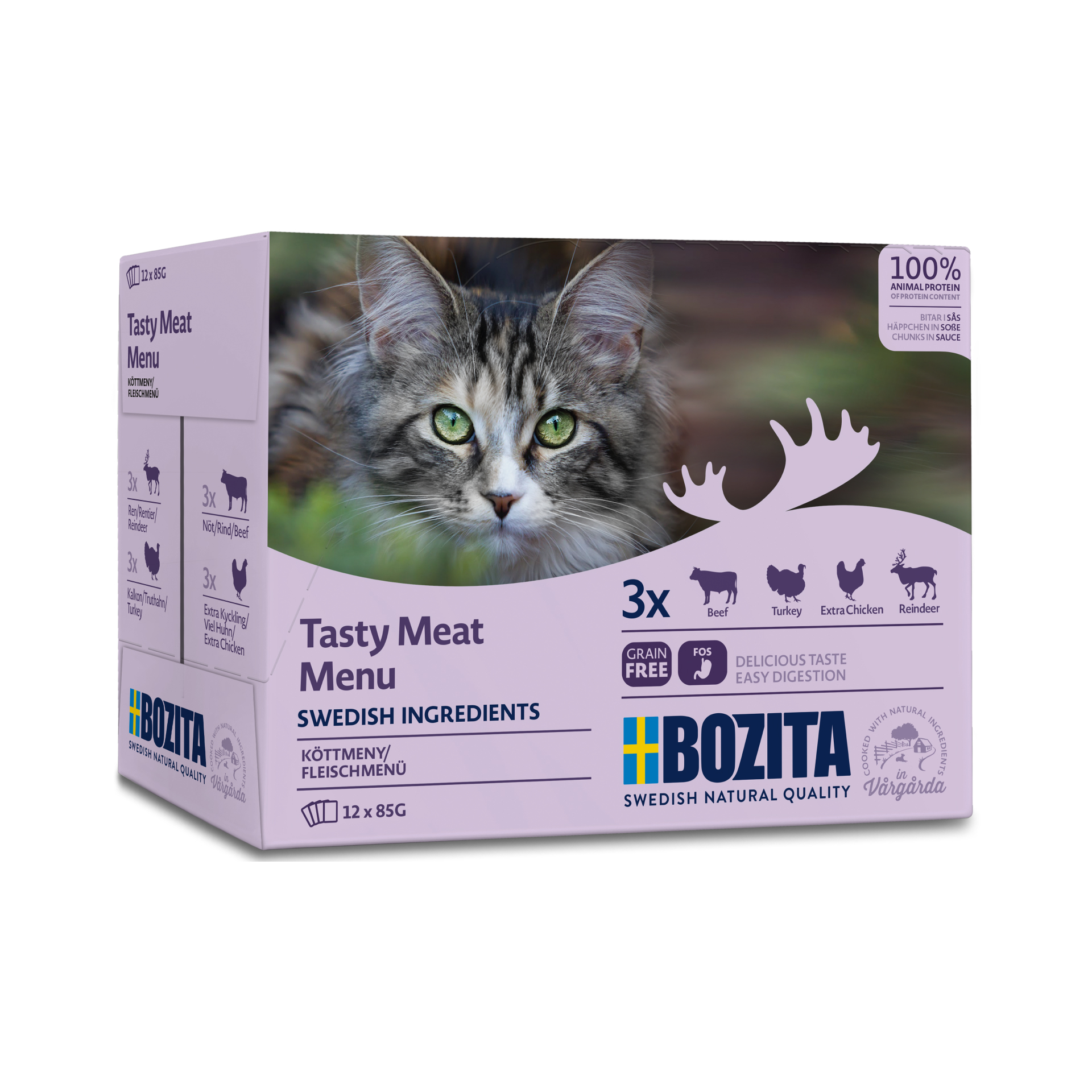 Bozita mokra karma w saszetkach w sosie to szwedzka jakość i smakowite pożywienie dla Twojego kota zawierające wszystkie niezbędne witaminy, aminokwasy i minerały. Jest to pełnoporcjowa, bezzbożowa karma, bez GMO, która w swoim składzie nie zawiera glutenu, cukru, soi ani żadnych barwników i sztucznych konserwantów. Te pyszne mięsne kawałki w sosie są pełnowartościowym posiłkiem dla Twojego pupila a swoim smakiem i aromatem zachwyci nawet wyszukane podniebienia.