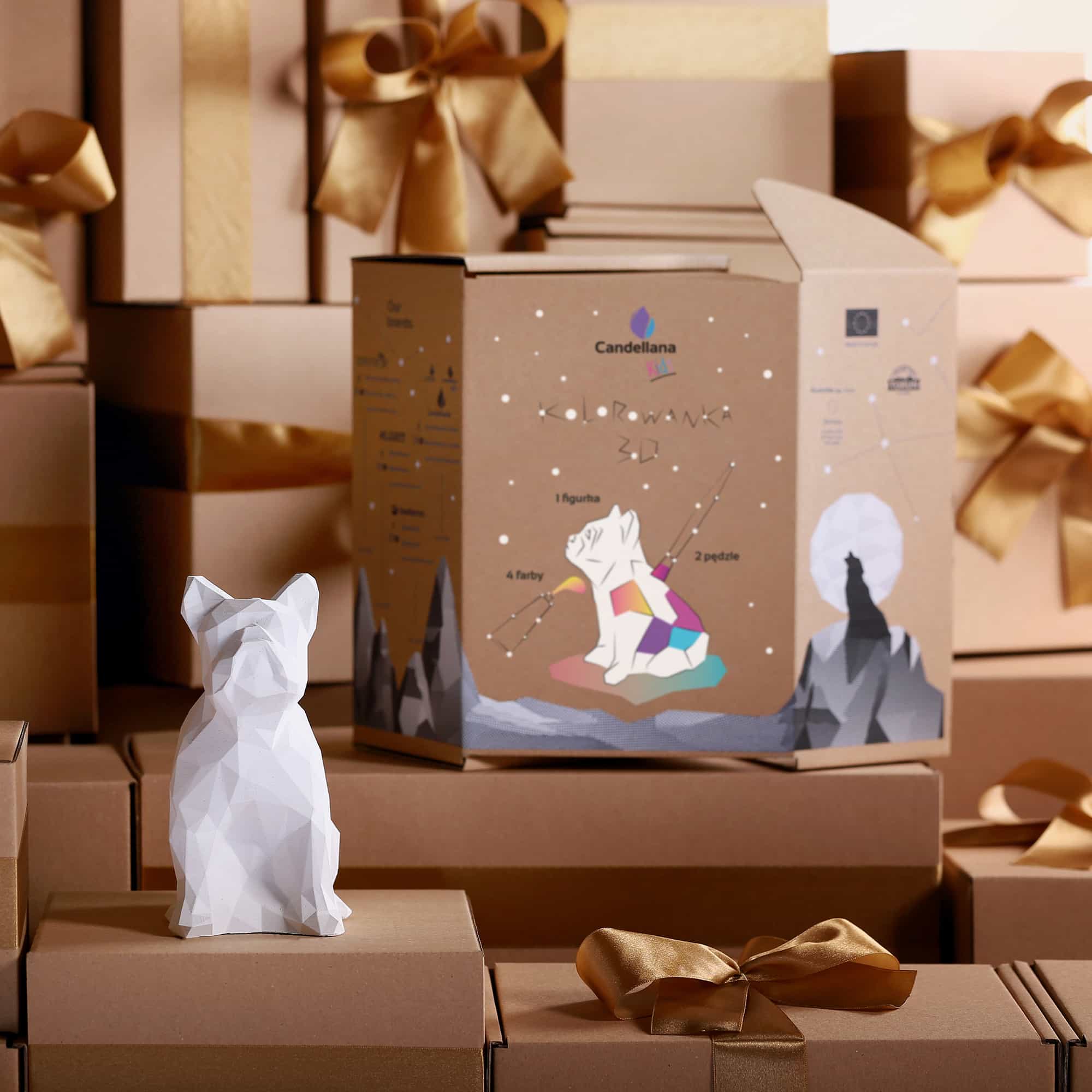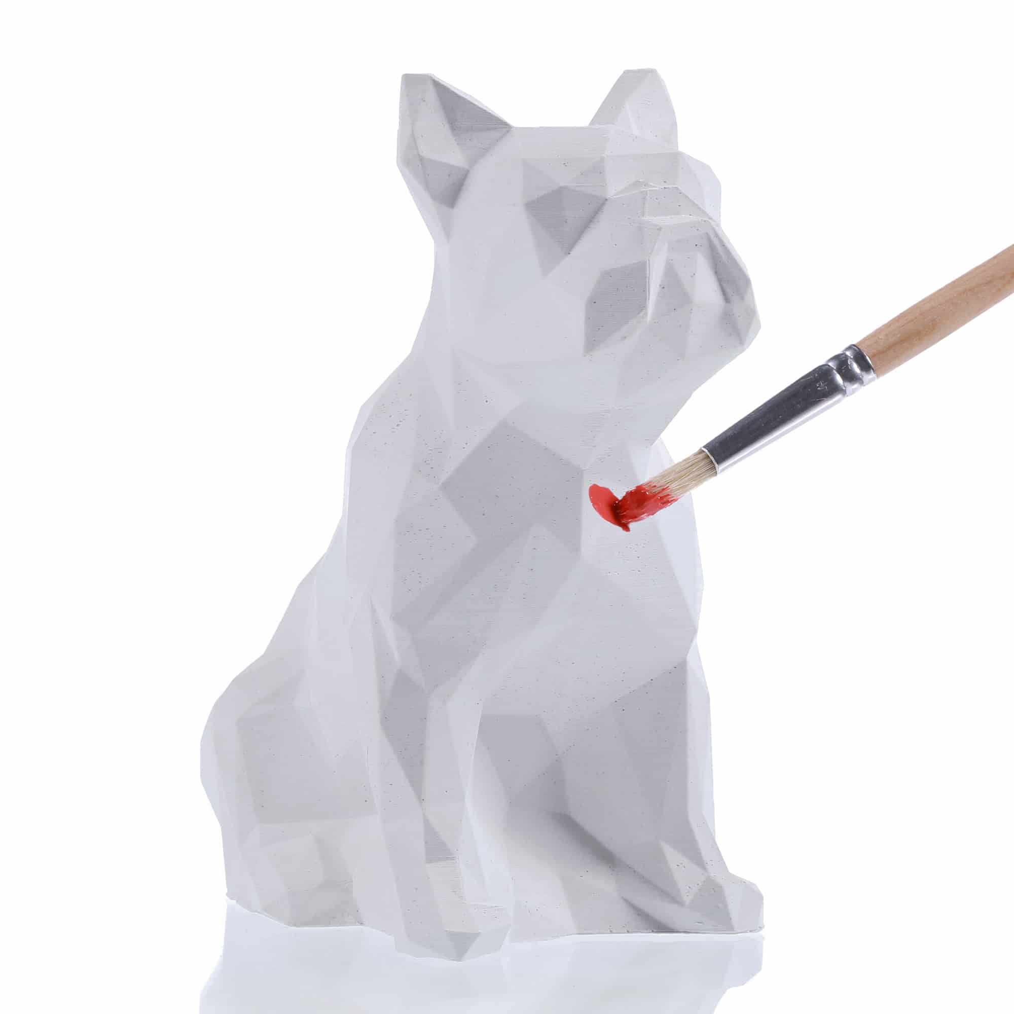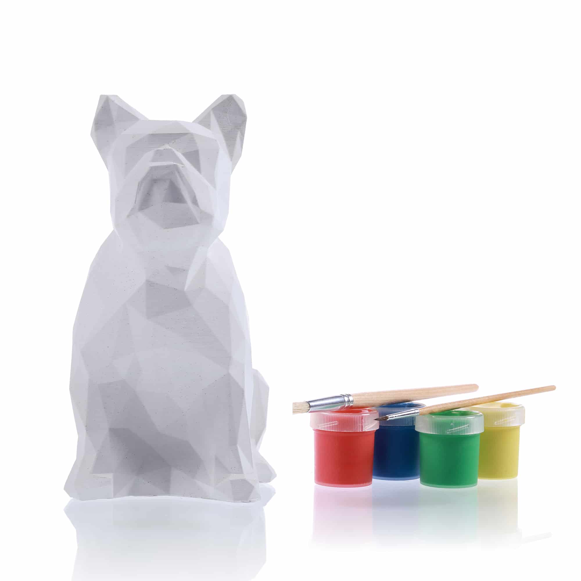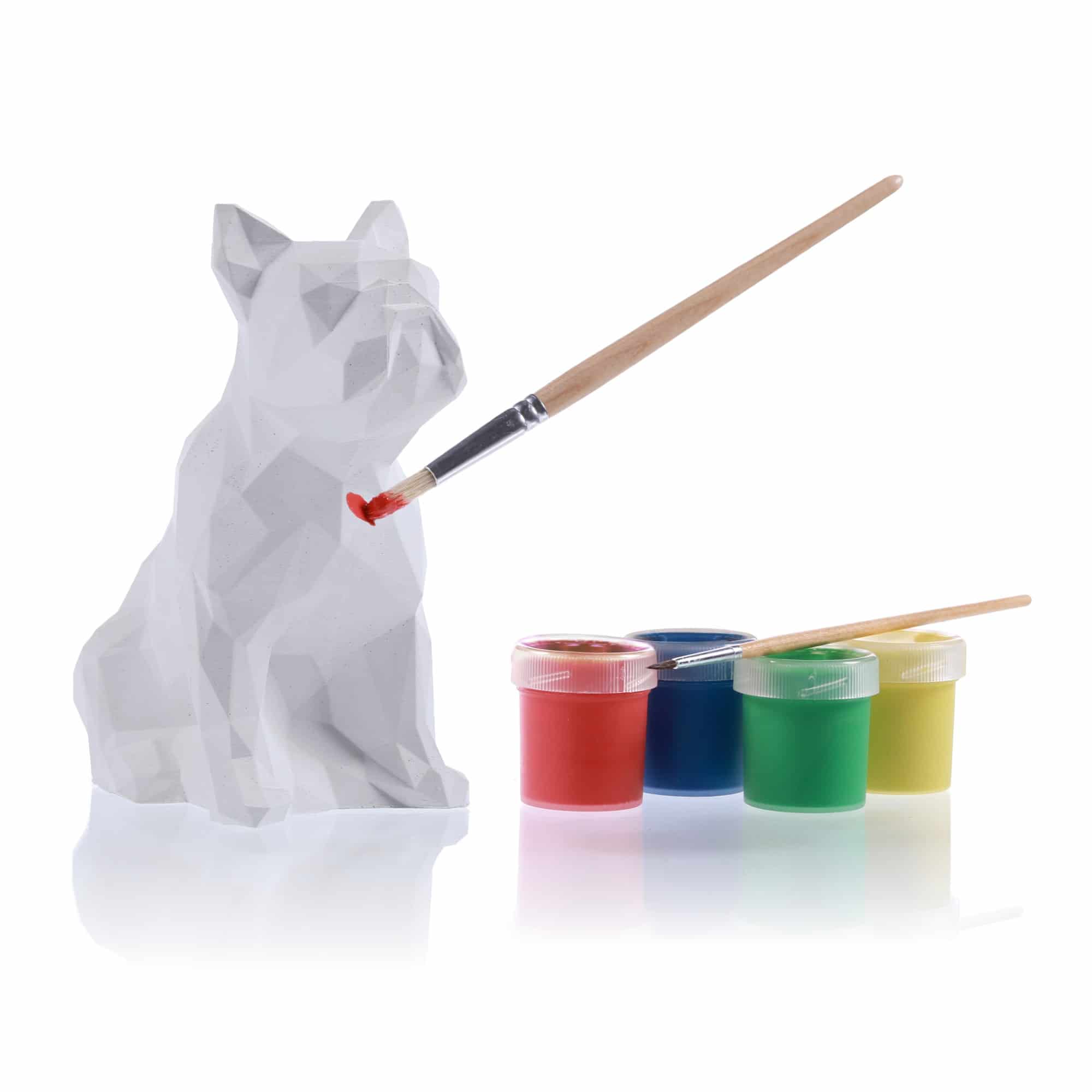 Candellana Kids Kolorowanka gipsowa 3D Bulldog Low Poly  to zestaw, który zawiera gipsową figurkę buldoga francuskiego, 2 pędzle oraz 4 farby.