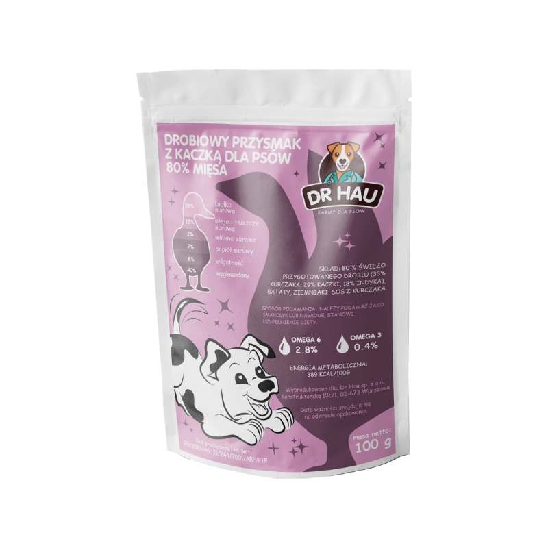 Skład: mięso z kaczki 93,1%, gliceryna 5%, skrobia 1,6%, sól 0,3%