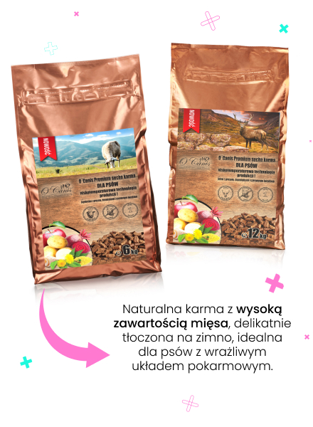 O'Canis sucha karma premium dla psa z jeleniem O’Canis Premium – sucha karma dla psów z jeleniem, prosem, czerwonym burakiem i jabłkiem to wyjątkowej jakości pełnoporcjowa karma stworzona z myślą o dorosłych psach wszystkich ras. Jej głównym składnikiem jest dziko żyjący jeleń, którego mięso dostarcza cenionego białka pochodzącego z naturalnego środowiska. Dzięki starannie opracowanemu procesowi niskotemperaturowemu wszystkie składniki zachowują swoją biologiczną wartość, co czyni tę karmę zdrowym i naturalnym wyborem dla Twojego psa. Karma nie zawiera zbóż, soli, cukru ani sztucznych dodatków. Główne źródło węglowodanów stanowi lekkostrawne proso, wzbogacone o czerwony burak i jabłka, które wspierają trawienie oraz dostarczają naturalnych witamin i minerałów. Dodatkowo mieszanka tłoczonych na zimno olejów roślinnych oraz oleju z dzikich ryb zapewnia niezbędne kwasy tłuszczowe Omega 3 i 6, wspierające zdrowie skóry, sierści, układu odpornościowego i krążenia.Unikalny proces niskotemperaturowy produkcji karmy pozwala zachować biologiczne wartości odżywcze wszystkich składników, bez ich denaturacji. Dzięki temu karma dostarcza naturalnych składników odżywczych i witalnych, wspierających zdrowie i kondycję psa.