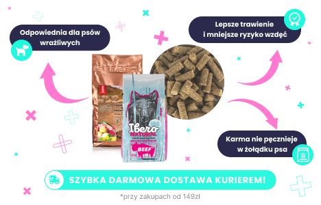 Ibero Cold Press karma tłoczona na zimno dla dużych i średnich psów z wołowinąIbero Cold Press Dog Adult Medium/Large Beef to wyjątkowa karma tłoczona na zimno, zaprojektowana specjalnie dla dorosłych psów średnich i dużych ras. Dzięki innowacyjnej technologii przetwarzania składników karma zachowuje naturalne wartości odżywcze, oferując doskonałą jakość i smak, który pokocha Twój pies. Ta karma wyróżnia się wysoką koncentracją składników odżywczych, co oznacza, że pies potrzebuje mniejszej ilości pożywienia, aby zaspokoić swoje dzienne potrzeby. To nie tylko zmniejsza ryzyko skrętu żołądka, ale także sprawia, że worek karmy wystarcza na dłużej. Suszona wołowina (31%) w połączeniu z naturalnymi warzywami, ziołami i dodatkami witaminowo-mineralnymi tworzy pełnowartościową dietę, idealną dla psów aktywnych, a także suk ciężarnych i karmiących.Analiza składu karmy dla psa:Białko surowe 24%, tłuszcz surowy 14%, włókno surowe 3,4%, popiół surowy 7,3%, wapń 1,1%, fosfor 0,85%, sód 0,15%, wilgotność maks. 10%.Skład karmy: Suszona wołowina (31%), tłuszcz (13%), suszone słodkie ziemniaki, suszone ziemniaki, płatki owsiane (8%), wątróbka wieprzowa (5%), suszona dynia (2%), suszona wątroba wieprzowa (2%), płatki kukurydziane, suszona marchew (1,2%), siemię lniane, ekstrakt z cykorii, suszone zioła, betaglukany, ekstrakt z chrząstki, mieszanka witaminowo-mineralna.