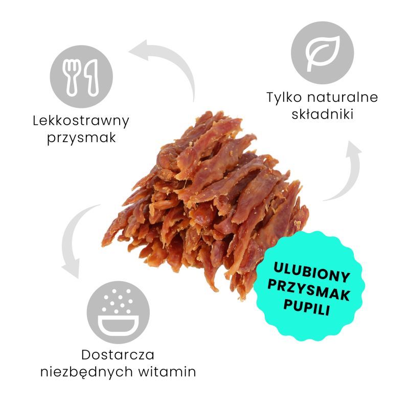 Miękkie paski z kaczki dla psa w dużym opakowaniu 500gMięso z kaczki zawiera dużo białka, fosfor, żelazo oraz witaminy z grupy A, B, E.Niskotłuszczowe i lekkostrawne, są idealnym uzupełnienie karmy podstawowej dla psów.Wspaniały smak powoduje, że mogą służyć jako nagroda do tresury lub przekąska między posiłkami.