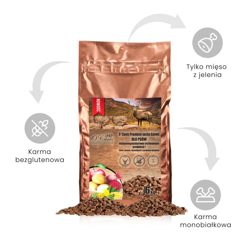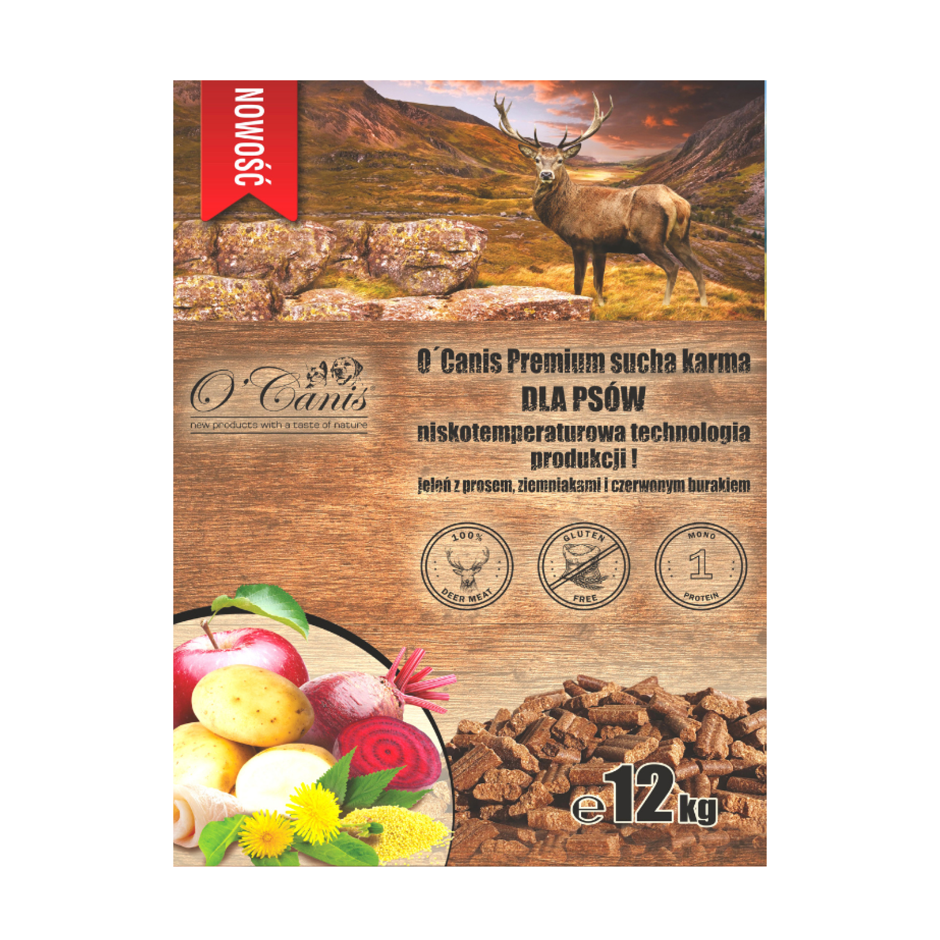 O’Canis Premium – sucha karma dla psów z jeleniem, prosem, czerwonym burakiem i jabłkiem to wyjątkowej jakości pełnoporcjowa karma stworzona z myślą o dorosłych psach wszystkich ras. Jej głównym składnikiem jest dziko żyjący jeleń, którego mięso dostarcza cenionego białka pochodzącego z naturalnego środowiska. Dzięki starannie opracowanemu procesowi niskotemperaturowemu wszystkie składniki zachowują swoją biologiczną wartość, co czyni tę karmę zdrowym i naturalnym wyborem dla Twojego psa.Karma nie zawiera zbóż, soli, cukru ani sztucznych dodatków. Główne źródło węglowodanów stanowi lekkostrawne proso, wzbogacone o czerwony burak i jabłka, które wspierają trawienie oraz dostarczają naturalnych witamin i minerałów. Dodatkowo mieszanka tłoczonych na zimno olejów roślinnych oraz oleju z dzikich ryb zapewnia niezbędne kwasy tłuszczowe Omega 3 i 6, wspierające zdrowie skóry, sierści, układu odpornościowego i krążenia.