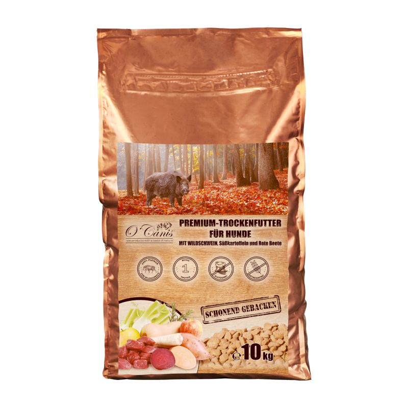 Pełnoporcjowa sucha karma O'Canis premium z dzika, słodkiego zimeniaka i buraków to bardzo dobrze strawna karma dla dorosłych psów wszystkich ras. Poddana procesowi pieczenia, dzięki czemu nie dodaje się do niej żadnych sztucznych dodatków czy tłuszczy, jest bezzbożowa i bezglutenowa.