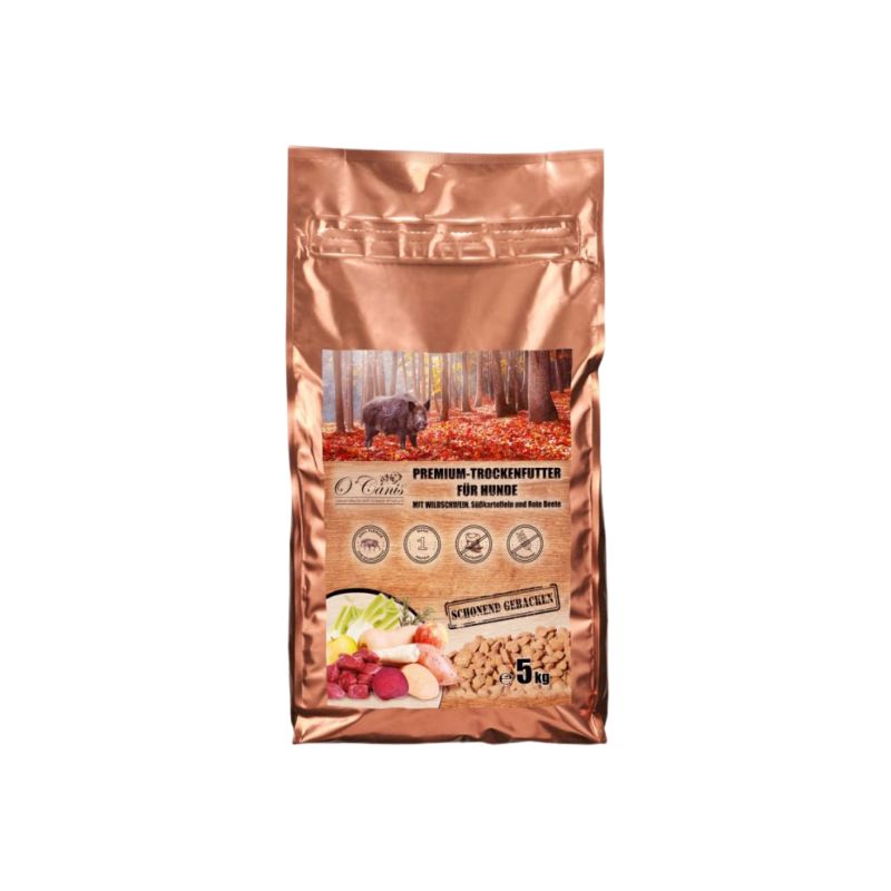 Pełnoporcjowa sucha karma O'Canis premium z dzika, słodkiego zimeniaka i buraków to bardzo dobrze strawna karma dla dorosłych psów wszystkich ras. Poddana procesowi pieczenia, dzięki czemu nie dodaje się do niej żadnych sztucznych dodatków czy tłuszczy, jest bezzbożowa i bezglutenowa.