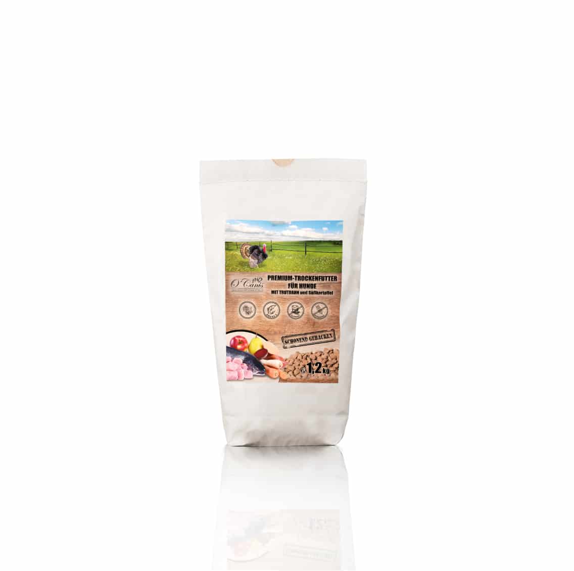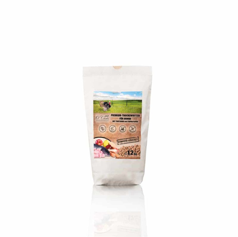 Skład karmy: Świeże mięso bez kości z indyka 25%, słodki ziemniak 18%, suszone mięso z kurczaka 13%, suszony łosoś 10%, burak czerwony 10%, jabłka 5%, marchew 3%, tłoczony na zimno olej rzepakowy 4%, gruszka 3%, pietruszka 3%, koper włoski 2%, rozmaryn 1%, ostropest 1%, amarantus 1%, juka Schidigera 1%. Może zawierać śladowe ilości obcego DNA z powodu kolejności produkcji.