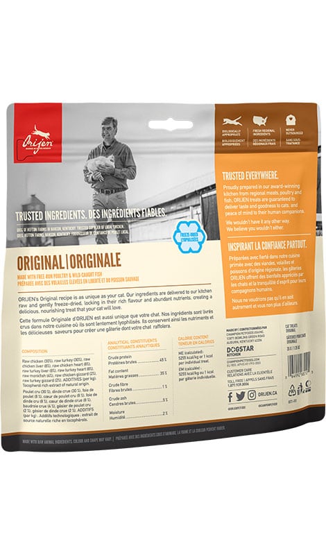 Przysmak dla kota Orijen to 100% surowego lub świeżego mięsa, nie zawiera żadnych sztucznych konserwantów. Mięso z kurczaka i indyka z chowu bezklatkowego oraz flądry łowionej w naturalnym środowisku, jest poddawane procesowi liofilizacji, dzięki czemu przekąska ma bardzo skoncentrowany smak i aromat, jest źródłem naturalnym składników odżywczych, które są niezbędne dla Twojego kota.