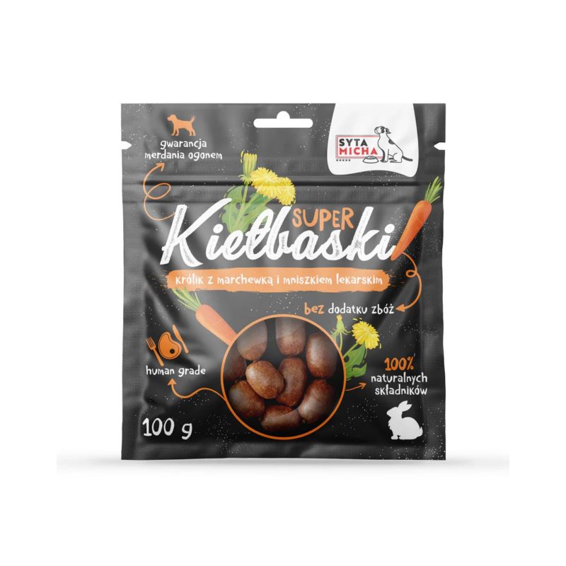 Super kiełbaski z królika od Sytej Michy to w 100% naturalne, suszone przysmaki stworzone z myślą o psach w każdym wieku. To chrupiące, aromatyczne przekąski o prostym i przejrzystym składzie, które doskonale sprawdzą się jako nagroda, urozmaicenie diety lub smakowity dodatek między posiłkami.Bazą przysmaku jest aż 95% mięsa mięśniowego z królika – delikatnego, lekkostrawnego i hipoalergicznego źródła białka. Mięso z królika charakteryzuje się niską zawartością tłuszczu, co sprzyja utrzymaniu prawidłowej masy ciała, a jednocześnie dostarcza cennych witamin i minerałów wspierających układ krążenia, nerwowy i kostny psa.