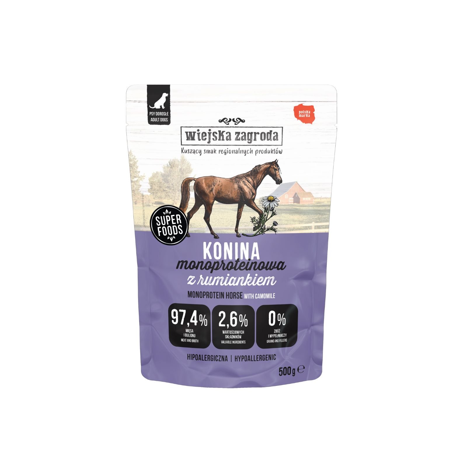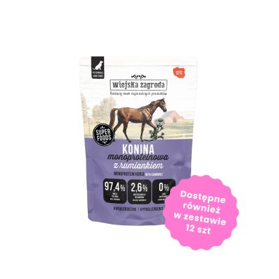 Wiejska Zagroda Konina z rumiankiem to monoproteinowa, bezzbożowa karma mokra dla dorosłych psów, stworzona z myślą o zwierzakach z wrażliwym układem pokarmowym i alergiami pokarmowymi. Zawiera aż 68% mięsa konia - lekkostrawnego źródła wysokiej jakości białka, żelaza i witamin z grupy B, które wspierają siłę, odporność i zdrową kondycję organizmu psa.