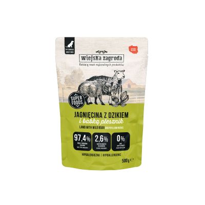 Wiejska Zagroda Jagnięcina z dzikiem to pełnoporcjowa, bezzbożowa karma mokra dla dorosłych psów wszystkich ras, stworzona z myślą o codziennym, naturalnym żywieniu. Zawiera aż 54% jagnięciny i 14% dzika, dzięki czemu łączy delikatność i lekkostrawność z intensywnym, dzikim smakiem, który uwielbiają psy.
