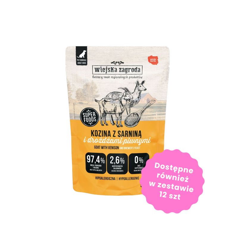 Wiejska Zagroda Kozina z sarniną i drożdżami piwnymi to pełnoporcjowa, bezzbożowa karma mokra dla dorosłych psów wszystkich ras, stworzona z myślą o naturalnym i zdrowym żywieniu. Połączenie koziny (54%) i sarniny (14%) zapewnia doskonałe źródło lekkostrawnego białka, które wspiera rozwój mięśni i kondycję psa.Dodatek drożdży piwnych dostarcza witamin z grupy B i naturalnych prebiotyków, które wzmacniają odporność, wspierają zdrową skórę oraz prawidłowe trawienie. Olej z łososia, spirulina, MOS i FOS tworzą zestaw składników prozdrowotnych, dbających o układ odpornościowy, florę jelitową i lśniącą sierść. To smakowity, naturalny posiłek, który łączy troskę o zdrowie z wyjątkowym aromatem dziczyzny.